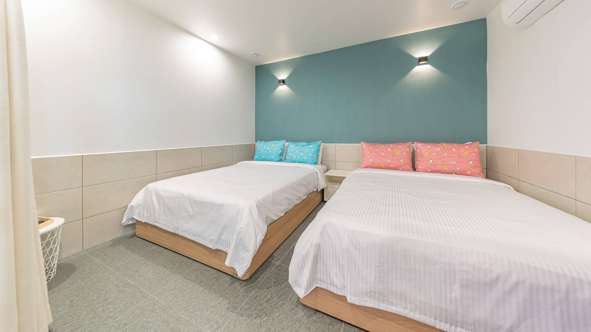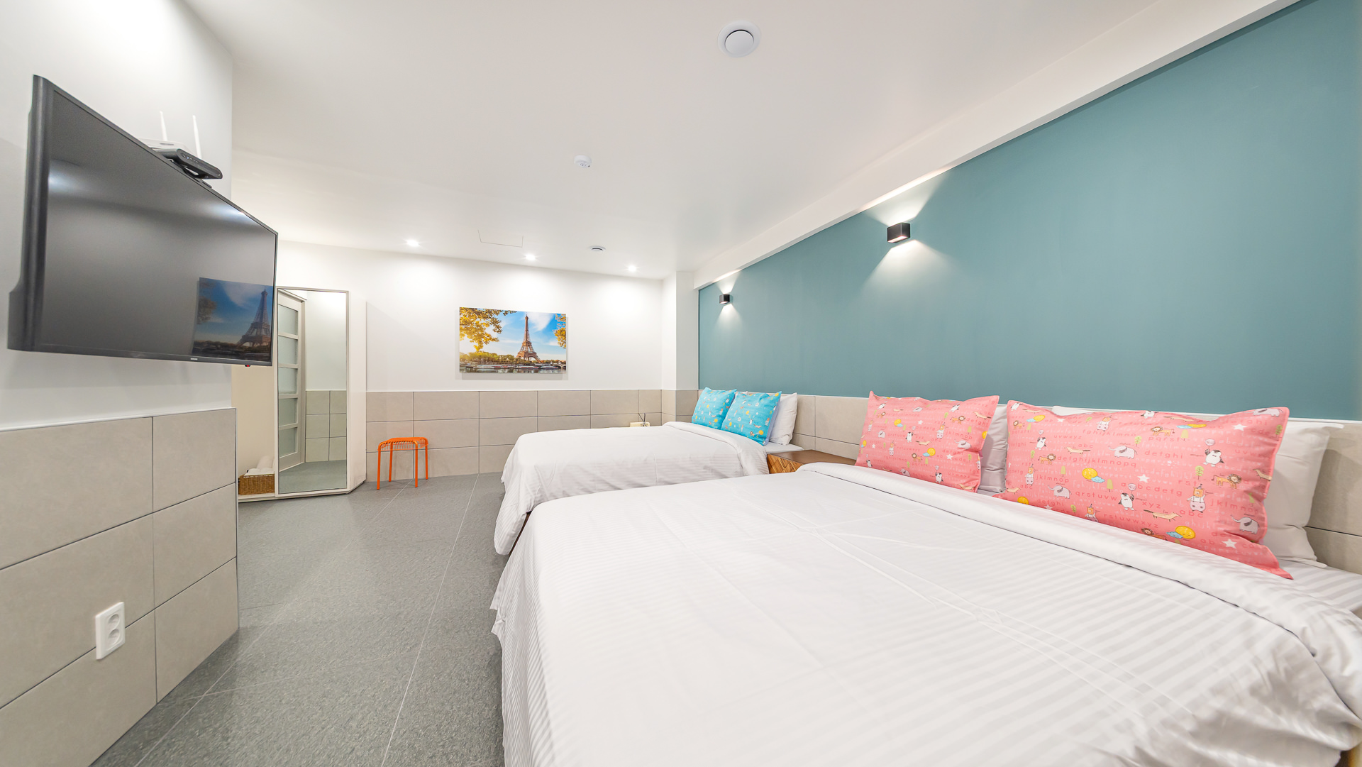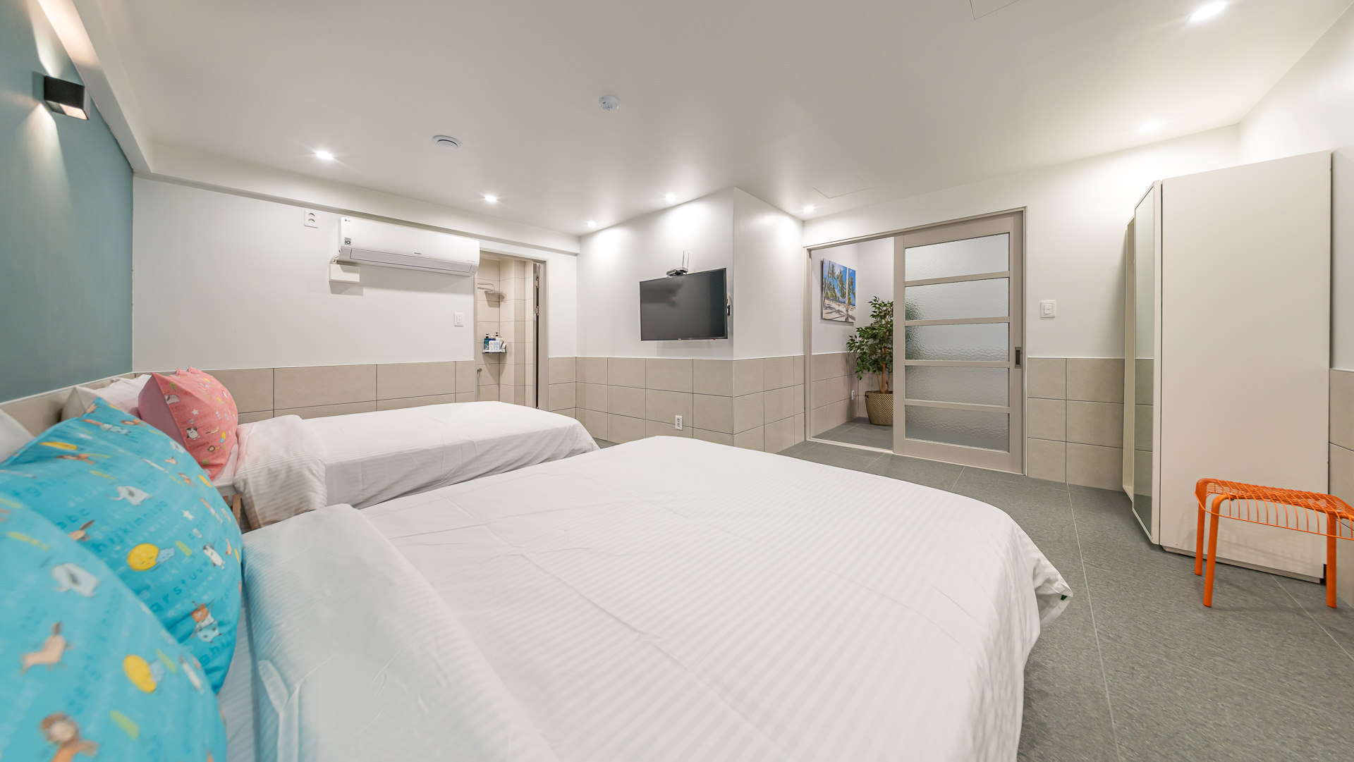 침대룸A(2층 침대방) + 침대룸B(퀸 2개) + 침대룸C(퀸 2개), 화장실/키즈전용, 가족